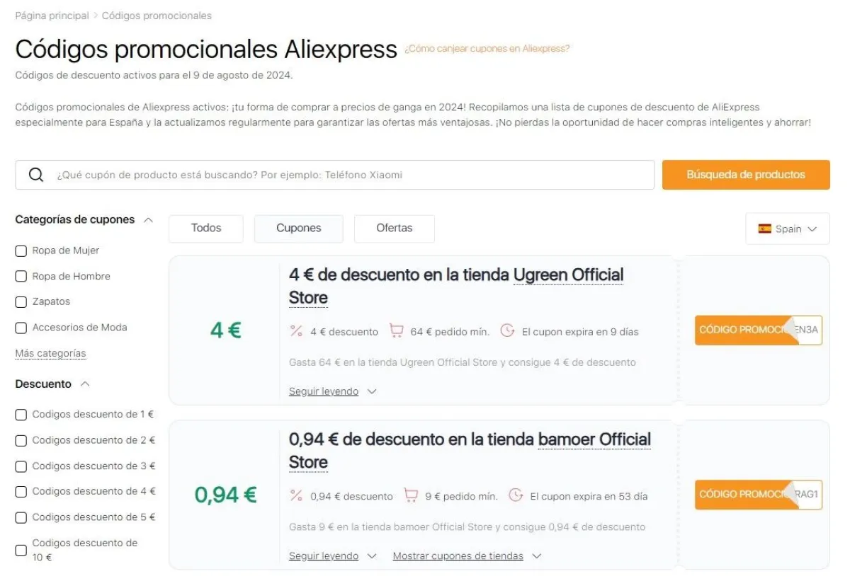 En colaboración con los desarrolladores de extensiones de navegador, AliExpress ofrece cupones especiales y Aliexpress código promocional. Estos códigos de descuento exclusivos de AliExpress están disponibles a través de un enlace y se actualizan regularmente para proporcionar ofertas vigentes. Los usuarios pueden buscar códigos promocionales específicos para países como España, Argentina, Chile, Perú, Colombia, México, entre otros. Además, es posible buscar cupones por categorías de productos, vendedores específicos y, lo más importante, por el nombre del producto, lo que hace que el proceso de búsqueda de descuentos sea más conveniente y dirigido.