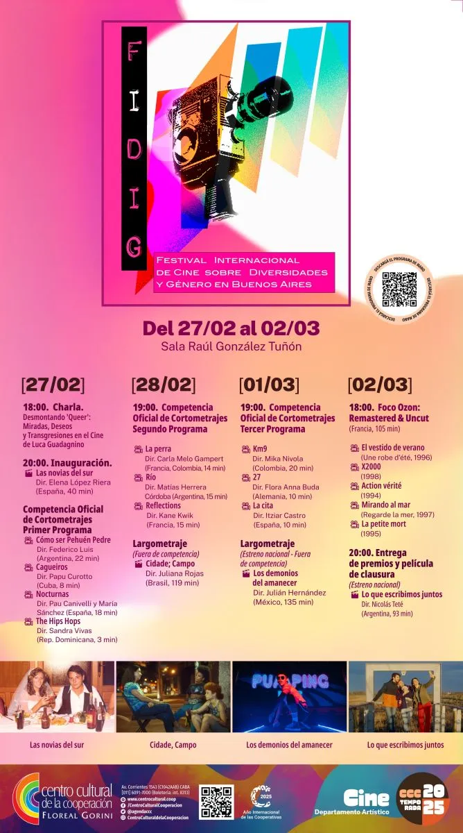 El Festival Internacional de Cine sobre Diversidades y Género de Buenos Aires (FIDiG Cine) celebra su primera edición del 27 de febrero al 2 de marzo en el Centro Cultural de la Cooperación. Con una programación que incluye estrenos nacionales, competencia de cortometrajes y actividades especiales, el evento busca consolidarse como un espacio de encuentro y reflexión sobre identidades, derechos y representaciones en el cine.