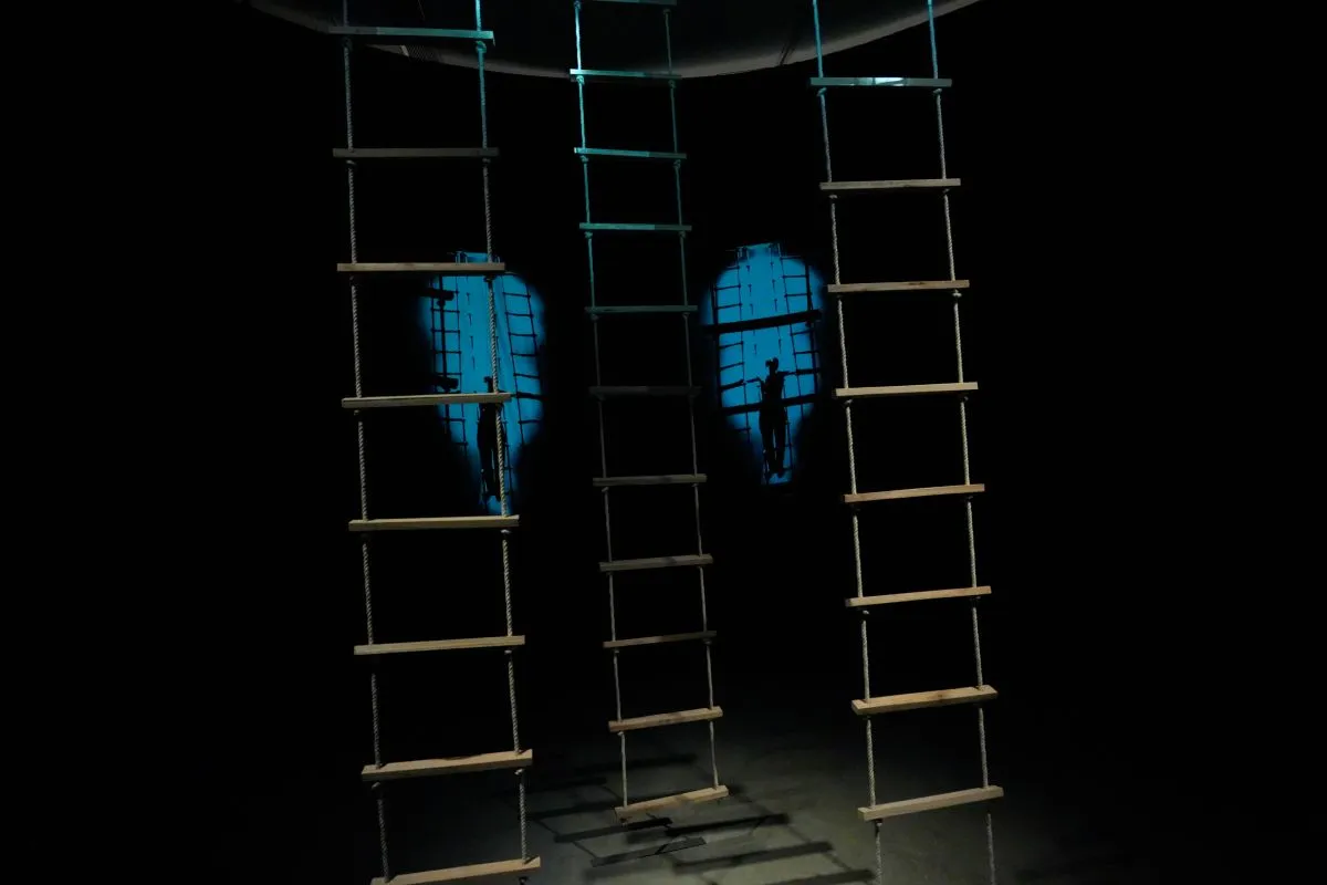 La exposición comienza con una escena dedicada a Roberto Villanueva, director del Centro de Experimentación Audiovisual del Instituto Di Tella. Sus montajes, entre 1963 y 1970, desdibujaron las fronteras entre mimo, danza, teatro y happening. En el CEA no se representaban obras: se ensayaban formas de percepción. Las piezas eran "objetos de prueba", decía Villanueva, que concibió el teatro como un laboratorio social. La muestra recupera ese gesto con una escalera que remite a El timón de Atenas y con su propia voz resonando en la sala como un guía íntimo.