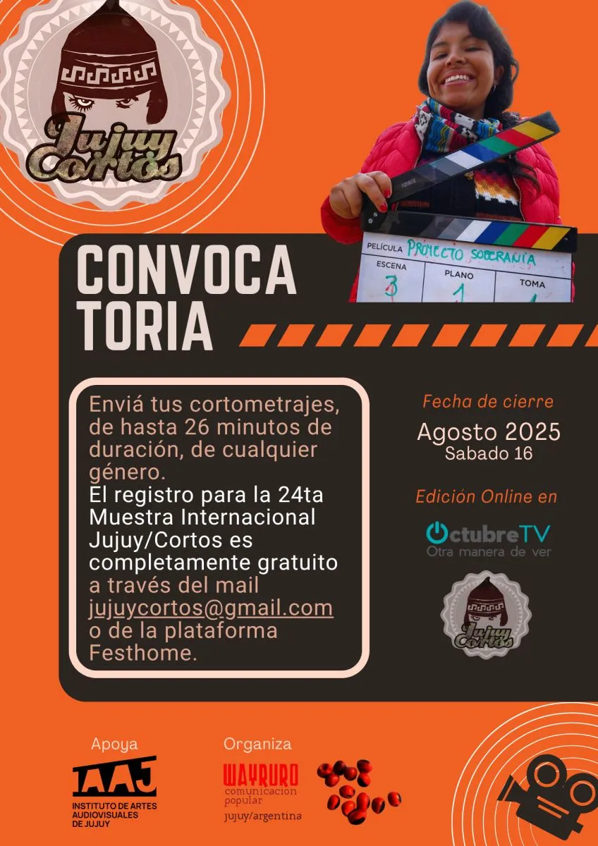 Desde mediados de julio, se encuentra abierta la recepción de cortometrajes para la vigésima cuarta edición de la Muestra Internacional de Cortometrajes "Jujuy/Cortos", un evento pionero en el Noroeste Argentino que se llevará a cabo a fines de octubre de 2025, de manera online, a través de la plataforma Octubre TV.