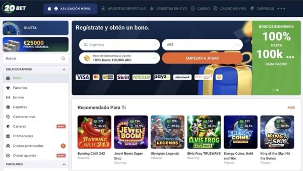 20bet no es el más rápido ni el de bono más alto. Es el más equilibrado. Sin puntos flacos graves. El bono de bienvenida aplica con Mercado Pago. Wagering x35–x40, estándar. Pros: Consistencia, soporte 24/7, Mercado Pago siempre disponible. Contras: Retiros no instantáneos.